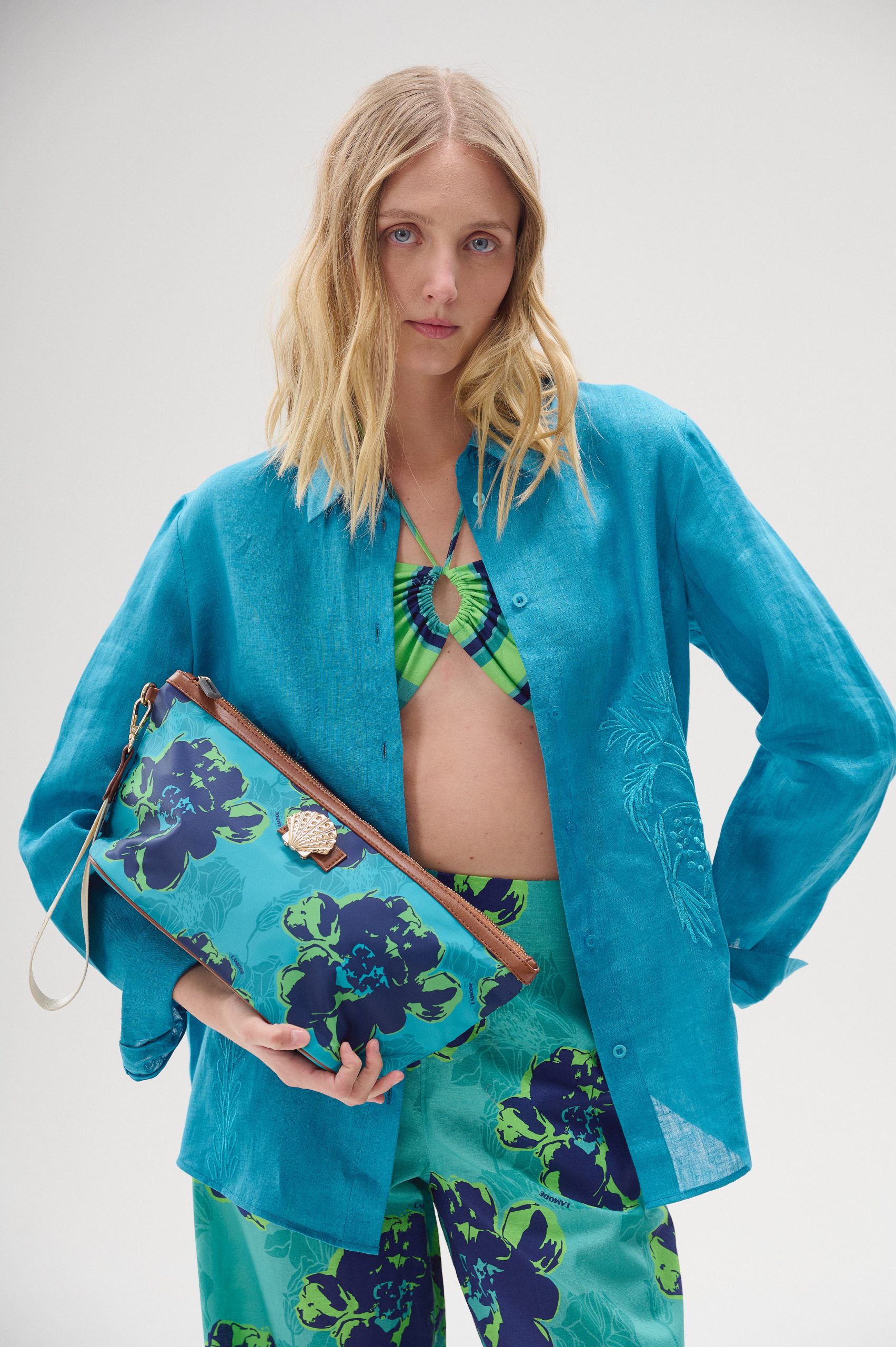 Necessaire de lona estampada, práctico y con mucho estilo. Su diseño combina prints exclusivos de la colección con detalles de terminación premium: cierre metálico, bordes en cuero ecológico y aplique en forma de caracola dorada que le da un toque distintivo.