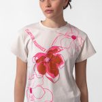 Remera de algodón en tono crudo con estampa exclusiva “Flower Market”. El diseño combina flores XL en tonos fucsia, logrando un contraste vibrante y femenino. Con corte recto, manga corta y detalle de etiqueta LAMODE en el ruedo, es una prenda cómoda y versátil para looks casuales con un toque artístico.